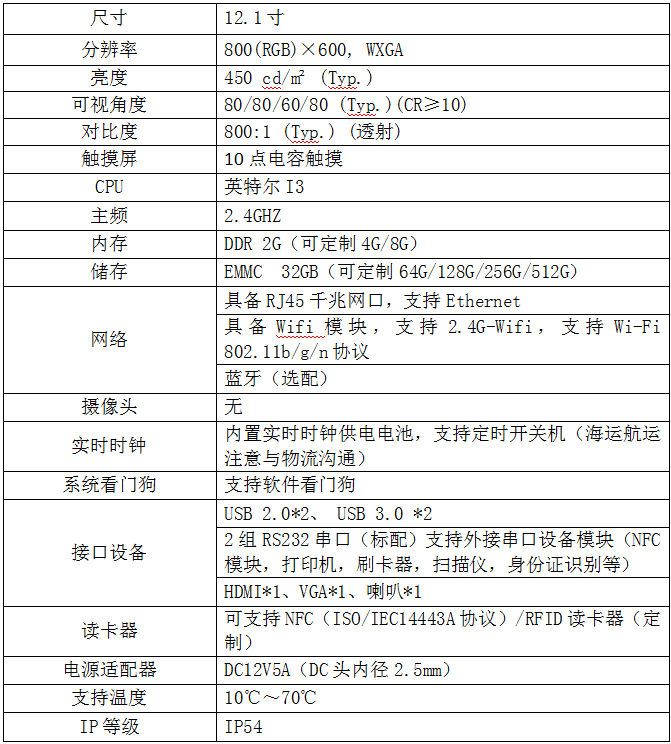 1、高性能低功耗CPU,搭载lntel I7处理器 2、支持拓展更多接口 3、标配8G DDR4+128G SSD大存储 4、纯平面板达IP65防水标准 5、高速传输能力,支持WiFi 2.4/5G 6、支持12V-36V宽压供电 7、海量定制选择,为您打造个性化产品